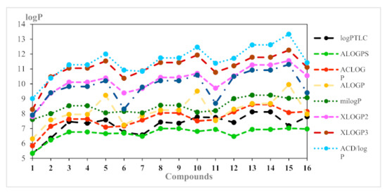 The next step of the research was to determine the logP parameter using the available computer software [20,21,22,23]. Depending on the mathematical module of the program used, the obtained values of the calculated logP covered a wide range, from 5.34 to 13.33 (Table 4).