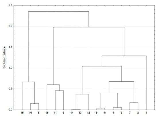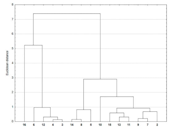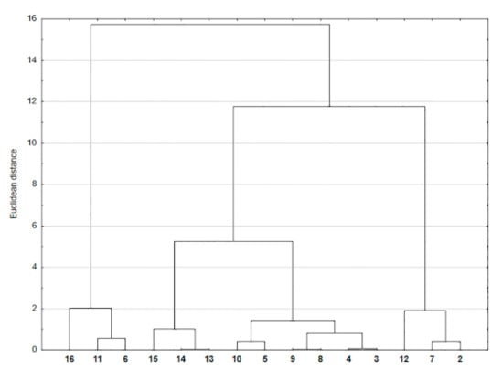 The correlation between logPTLC and the calculated parameters is characterized by low regression coefficients (r = 0.066–0.624). The results indicate that there is no significant relationship between the lipophilicity and pharmacokinetic parameters. As an additional description of the analyzed hybrids (2–16), cluster analysis was performed, taking into account the experimental lipophilicity values and the physicochemical (M, nHA, nHD, nRT, and TPSA) and pharmacokinetics properties (logBB). The results are presented in Figure 4.