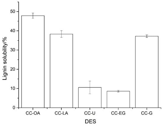 The lignin solubility after DES pretreatment is shown in Figure 1. The solubility varies significantly with DES formed by different hydrogen bond donors. A maximum solubility of 47.85% is shown by the CC-OA donor, and a minimum solubility of 8.60% is exhibited by the CC-EG donor. The existence of hydrogen bonds in eutectic solvents had an effect on the ether bonds in lignin, which reduced the energy required for their cleavage [8], and the lignin molecules dissolved in the solvent. The solubility of lignin in acidic DES was higher than that in basic DES because the hydrogen bonding is stronger in the former. The hydrogen bonds between the carboxylic acid and chloride ion in the CC-LA and CC-OA solvents were strong. In addition, the carboxyl group (-COOH) can easily react with the hydroxyl group (-OH) on cellulose to form monoesters or cross-linked diesters. Diesters can prevent cellulose from dissolving during acid hydrolysis [24]. CC-LA and CC-OA inhibited the dissolution of cellulose and enhanced the degradation of lignin. In the other three solvents, the hydrogen bond formed between the hydroxyl group and chloride ion was weak; thus, the solubility of lignin was low. However, the solubility of lignin in CC-U (10.53%) was significantly higher than that reported earlier (2.5%) [25]. This may be because bagasse and wood have different structures.