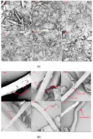 The morphological changes of bagasse fiber under DES pretreatment were observed by SEM. As shown in Figure 2a, cellulose was well-coated with lignin and hemicellulose, and a major portion of the cellulose was unexposed. The bagasse showed long fiber bundles. The rigid connecting structure between lignin and hemicellulose in bagasse was destroyed after DES pretreatment; the fiber bundles became “fragmented,” and there were irregular sheet cells, wherein cellulose was exposed. A particularly high amount of cellulose was exposed after the CC-OA treatment. As shown in Figure 2b, the middle lamella of untreated fibers did not fall off completely; the fibers retained a relatively complete and ordered fiber structure, and the surface of the fiber was relatively clean without distinct fuzzing. After DES pretreatment, the intercellular layer of the fibers degraded to different degrees. The fiber surface treated by CC-G and CC-EG exhibited a distinct fuzzing phenomenon. The S1 layer of the fiber was exposed; however, the overall geometric status of the fiber did not change significantly. After pretreatment with CC-U, CC-OA, and CC-LA, the intercellular layer of fiber almost completely fell off, and numerous holes were exposed on the surface of the fiber. As the specific surface area of the fiber increased, the fiber showed different degrees of bending, torsion, and deformation, and the overall geometric status changed significantly. Overall, the surface of the treated fiber exhibited evident peeling off and fine fibrosis.