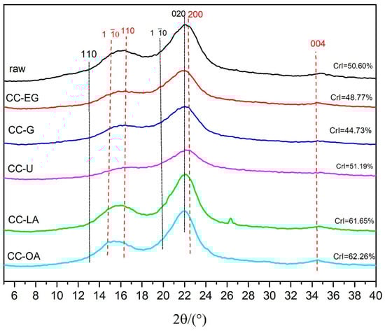 The crystal structure and relative crystallinity of the bagasse residue were investigated using XRD (Figure 3). Based on previous studies [26,27,28], the (110), (110), (200), and (004) crystal planes of cellulose I are generally located at 2θ = 15.0°, 16.4°, 22.5°, and 34.5°. Before and after pretreatment, the samples exhibited a certain absorption at these positions, showing the presence of cellulose I. The (110), (110), and (020) crystal planes of cellulose II are generally located near 2θ = 13.0°, 20.0°, and 22.0°. The major peak in the absorption spectra of the samples was observed at 22.0°; thus, cellulose II was the main crystal form. After CC-U, CC-OA, and CC-LA pretreatment, the crystallinity of bagasse increased. In the CC-OA- and CC-LA-treated samples, the crystallinity increased to 62.26% and 61.65%, respectively. The increase in crystallinity for the CC-U pretreatment was relatively small. In contrast, after CC-G and CC-EG pretreatment, the crystallinity of bagasse decreased slightly. This may be because of the dissolution of some substances in the crystallization zone during pretreatment [29]. After further analysis, CC-LA was found to be more inclined to separate hemicellulose, and CC-U, CC-G, and CC-EG were more inclined to separate lignin.
