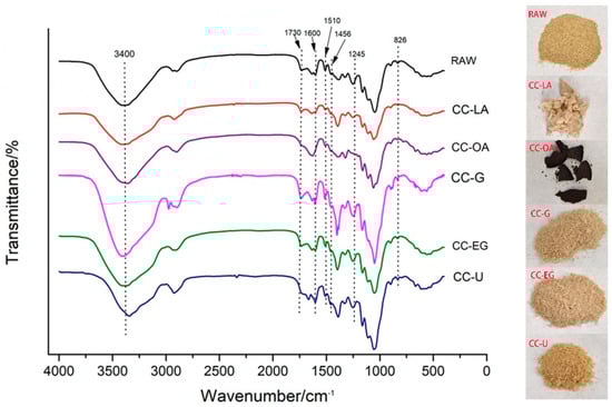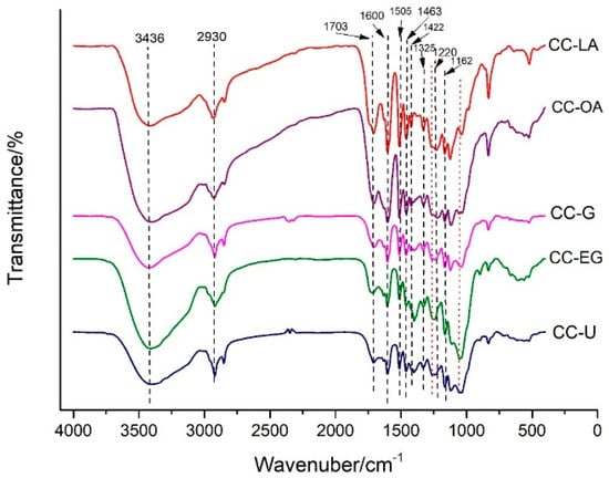 As shown in Figure 5, the stretching vibration of hydroxyl was observed at 3436 cm−1. The strong absorption peaks at 1600, 1504, and 1422 cm−1 represent the characteristic absorption peaks for the vibrations of the benzene ring skeleton of lignin [31]. The peak at 1463 cm−1 is attributed to the C–H deformation combined with aromatic ring vibration, which indicates that the separated part was indeed a lignin component [12]. Thus, the benzene ring skeleton structure was undamaged and well-protected. At approximately 1325 and 1220 cm−1, the absorption peaks of the Syringa core and C-H were observed, which indicated that the lignin structural units isolated from bagasse contained several syringyl units (S). The weak peak at 1263 cm−1 corresponds to the stretching vibration of C–O in guaiacyl [32]. After treatment with CC-G, CC-U, CC-LA, and CC-OA, the extracted lignin contained a small amount of guaiacyl structural units (G), indicating that the lignin extracted by DES belonged to the G and S types. The absorption peak of the ether bond C-O-C was observed at approximately 1162 cm−1. The aryl ether bond between lignin structural units did not break during the DES treatment of bagasse cellulose. When DES reacted with bagasse components, there was no shear effect on the ether bond of lignin [33]. At 1033 cm−1 (corresponding to C-H bending vibration in carbohydrate), the peak of lignin extracted by DES was weak or absent, indicating that the content of carbohydrate was less and the lignin purity was significantly high.