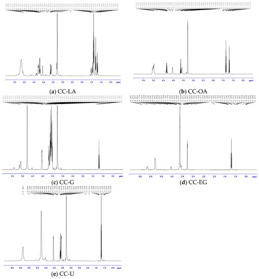 According to a previous study, 0.8–1.4 ppm corresponds to the hydrogen content of aliphatic branched chain in lignin [34]. The signals at 3.7 and 2.5 ppm correspond to the protons of methoxy groups in aromatic rings and aliphatic carbon chains, respectively, while 3.3 ppm represents H3 of β-D-xylopyranose. The 4.3 ppm signal corresponds to the γ-acylation of lignin, and the 4.94 ppm signal is in the form of β-β connection, which is the tetrahydrofuran structure [35]. The signal peak of 5.3 ppm corresponds to the hydrogen proton on the α-site carbon of the α-O-4 junction unit [36]. The signal peak of 6.3 ppm corresponds to the hydrogen proton on the α-site carbon of the β-O-4 junction unit [37]. As shown in Figure 6, the lignin dissolved in the five kinds of recovered DESs all had corresponding signal peaks at the position of 0.8–1.4 ppm. Methoxyl protons at 3.7 ppm signal peak can be detected in all samples, the peak signal at 4.3 ppm was detected after CC-LA and CC-OA treatment, which indicated that the activity of DES increased after acid DES pretreatment. The signal peak at 5.3 ppm was only detected in CC-LA and CC-G samples. The signal peaks above 6.0 ppm were very weak or even absent. It shown that the content of lignin and its degradation products was too low, or lignin was decomposed into polysaccharides with smaller molecular weight. This result was similar to that of XiaoJunShen et al. [19].