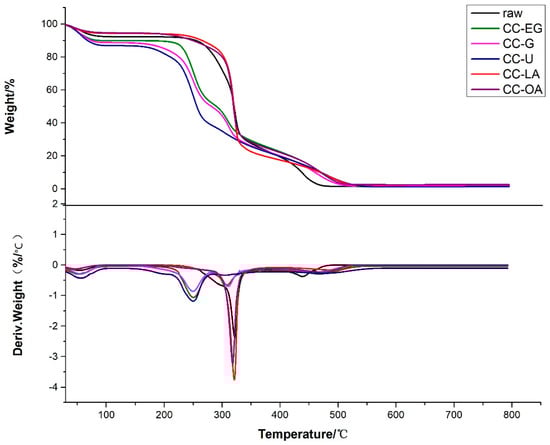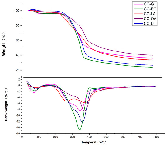 After CC-OA treatment, the weight loss rate in the second stage of pyrolysis was low (approximately 3.5%), indicating that the hemicellulose had been separated. The highest value of weight loss was approximately 60% at 338 °C, which was the pyrolysis temperature of cellulose. According to a previous study, a higher crystallinity of cellulose leads to better thermal stability [39]. Based on the XRD and SEM analyses, the crystallinity of the pretreated sample was higher, and the exposure rate of cellulose was higher. Therefore, the weight loss rate was mainly concentrated in the pyrolysis stage of cellulose, and the thermal stability was improved. The weight loss rate of CC-OA in the fourth stage was almost zero, indicating that lignin had been successfully separated, which is consistent with the previous FTIR analysis. After CC-LA pretreatment, the weight loss rate of the sample in the second stage of pyrolysis was low, indicating that hemicellulose had been separated from the sample. The pyrolysis range of the third stage was narrow, and the pyrolysis of cellulose in the crystalline region was mainly in this stage. In the fourth stage, the weight loss rate was approximately 22%. A large amount of lignin remained, illustrating that CC-LA mainly caused the separation of hemicellulose, and that of lignin was low. After pretreatment by CC-G, CC-EG, and CC-U, the crystallinity was low and the weight loss rate of pyrolysis was mainly concentrated in the second and third stages, and the fourth stage was significantly small. These results show that these DESs can effectively separate lignin from bagasse and retain most of the hemicellulose and cellulose.