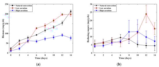 Figure 3) show a variation in a range between 4 and 25 mg/g ds for the three regimes. The maximum RS values reached for the three treatments were 23.92 mg/g ds on the 12th day for LAR, 13.11 mg/g ds on the 10th day for HAR, and 9.27 mg/g ds on the 6th day for NC. These values coincide with the start of the stationary phase for the two forced aeration regimes, and with the middle of the growth phase for the NC treatment. It is presumed that the RS are generated at a constant rate throughout the fermentation as a result of the degradation of carbohydrates present in the substrate, so that their variation in time is due to the consumption of simple sugars by the fungi as an energy source necessary for their growth. Additionally, selective lignin-degrading fungi, such as