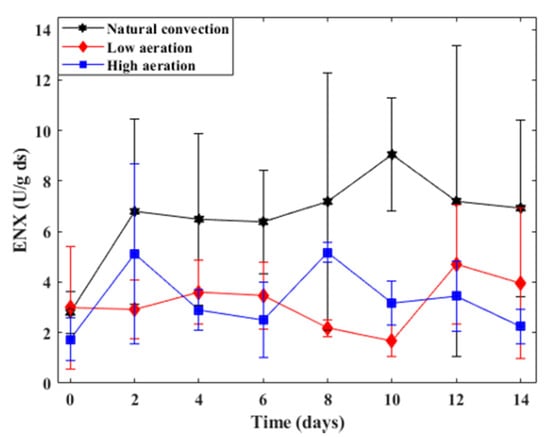 Figure 5 shows the time profile of the ENX titers for the three regimes. The ENX profiles obtained do not show a clear trend with time. In fact, the data of this activity oscillate in a range of about 20% of its average value over time for NC and about 50% for the two forced aeration levels. These variations are comparable with the standard deviations of the mean value of the experimental ENX measurements, which is related to the random errors of the analytical procedure employed (shown in