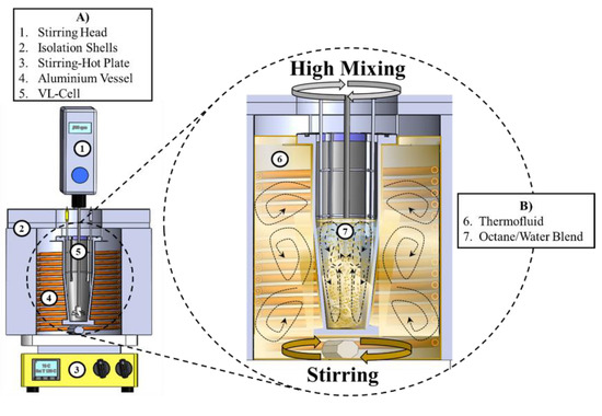 The Chemical Reactor Engineering Center (CREC) recently developed a CREC VL Cell which allows the measurements of VLL equilibrium (Figure 1) using a “dynamic method”, with the temperature of the cell increasing progressively, using thermal ramp of 1.22 °C/min. As a result, every run provides a large amount of vapor–liquid equilibrium data (10 Hz), with the vapor pressure data being recorded at various temperatures, every 0.01 s. Additional explanations about the cell operation are reported in [10,11]. Data obtained from this dynamic method has been validated with static measurements [10,11].