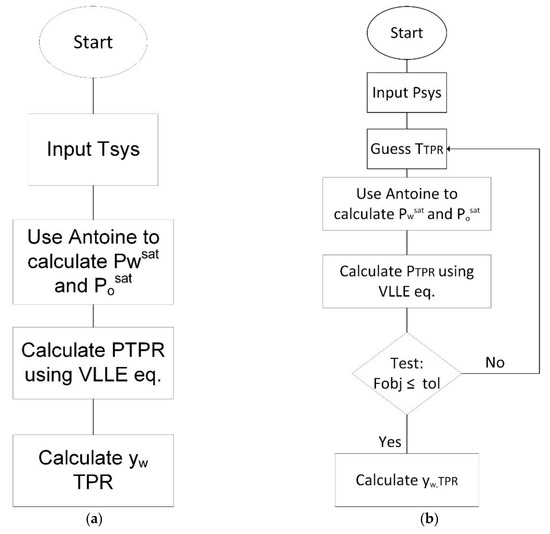 Figure 2 reports the calculation procedure for the TPR conditions, in the case of Pxy (fixed T) and Txy (fixed P) calculations. One can notice in Figure 2a that when the temperature is fixed, the establishment of a Pxy involves a direct calculation. However, in the case of calculating Txy at a set pressure (Figure 2b), the process of calculation becomes iterative, and one has to use a Newton–Raphson or a successive iteration algorithm with set objective functions.