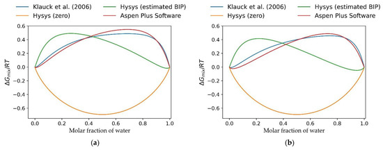 In Marcilla et al.’s study [8], 12 examples using Aspen Plus for the LLE data regression were described. Three of them reported inconsistencies, with the cause being assigned to the calculation algorithm. In this regard, as Marcilla et al. [8] stated, the use of unreliable parameters can create severe uncertainty, when used in chemical process simulation software. Furthermore, given this situation, Marcilla et al. [8] recommended the use of the minimization of the Gibbs energy of mixing function Δ G m i x / R T , as an additional condition to ensure the phase equilibrium prediction consistency.