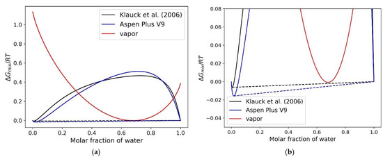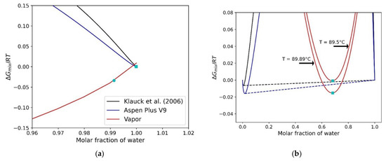 Thus, to establish the change of mixing Gibbs free energy for the liquid phase as per Equation (11), one must vary the xi values in the 0 to 1 range. In this respect, a common tangent plane criterion can be applied to multiple liquid phases as described in [5,35,36]. Furthermore, and to compare the Gibbs free energy of mixing curve for liquid and vapor phases, it is important that both phases have a common reference state [35]. In this respect, the pure component as liquid at the same temperature and pressure as the mixture, is selected as the reference state G i , o L R T = 0 .