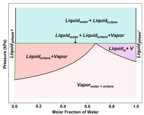 Regarding the cases with two liquid phases being present, as in water and hydrocarbons, the chemical species involved included partially miscible phases. As well, given that both liquid–liquid phases contribute to vapor pressure, they form a three-phase system: two liquid phases and a single vapor phase (VLL) [5]. This “Three Phase Region Domain or (TPR)” can be represented using TTPR and PTPR, with all three phases (vapor–liquid–liquid) containing the various chemical species [31].
