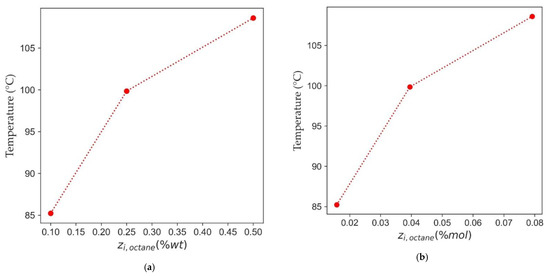 HYSYS V9 and Aspen Plus V9 software contain VL and VLL equilibrium modules, which were used as a starting point for the evaluation of conventional thermodynamic models, in the present work. Water/n-octane systems have been experimentally studied in previous works [10,11]. Furthermore, and regarding n-octane–water blends, there is already a significant body of data in the technical literature, as shown in Table 2.