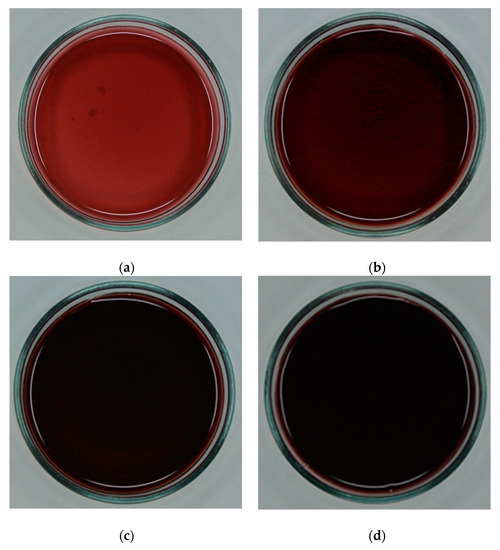 The CIELab color space parameters were measured directly using a spectrophotometer (CM-5, Konica Minolta, Osaka, Japan), and it was standardized each time with a standard white tile using illuminant D65 and an observation angle of 10°. The sample was filled in a glass cuvette, and thus, the CIELab values of L* (lightness; 0 = black, 100 = white), a* (−a* = greenness, +a* = redness) and b* (−b* = blueness, +b* = yellowness) were measured. Moreover, the total color difference (ΔE*) was calculated by Equation (1):