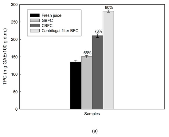In the same way, the PR retention values (Figure 2, percent values) indicated that the highest PR values were detected in the CFBFC process, with values close to 80%, 75%, and 69%, for TPC, TAC, and TFC, respectively. The results are equivalent to those informed by Orellana-Palma et al. [13], Casas-Forero et al. [35] and Correa et al. [50], who indicated PR retention values from 53% to 95% after multiple cycles for different food liquids. The high retention in TPC, TAC and TFC displays the advantage of the filter in the centrifugal BFC process, since the results indicate that only one centrifugal cycle is necessary to obtain a high retention in comparison to other BFC studies, which used three concentration cycles [24].