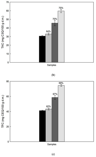 Polyphenolic compounds in samples: (a) TPC; (b) TAC; (c) TFC.