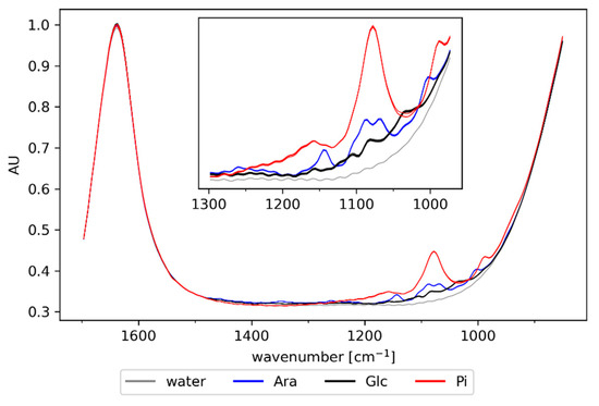 Off-line spectra of major medium components: water, l-arabinose (Ara; 100 mM), glucose (Glc, 55 mM), and phosphate (Pi, 130 mM). Air was subtracted as background.