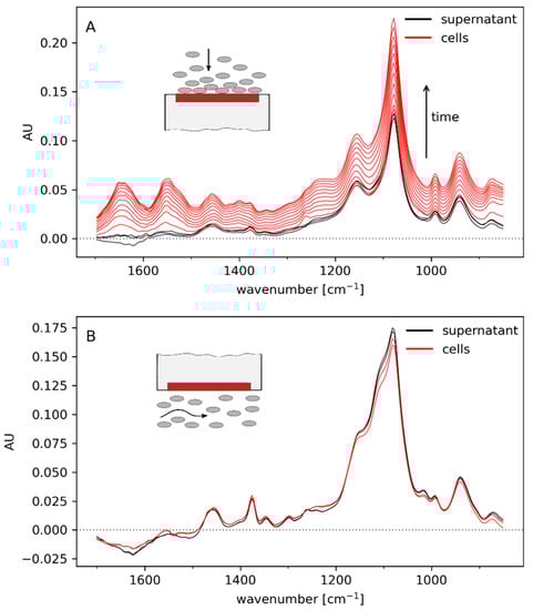 The spectral contribution of cells was also assessed in off-line experiments. After placing a drop of cell suspension on the sensor in an upright position, the cells settled quickly onto the ATR crystal. This revealed distinct absorbance at the amide I and II bands (1655 and 1550 cm−1, respectively) as well as at 1077 cm−1, which may be attributed to cellular carbohydrates [16] (Figure 2A). The increase in absorption across the whole spectral range is attributed to scatter effects. In contrast to the spectra of settling cells, the impact of biomass was much weaker when the spectra were recorded with the ATR probe immersed in a stirred cell suspension (Figure 2B). This was as expected since the penetration depth of the evanescent field, in which absorbance occurs, is only ~0.05–2 μm and thus too small for a large number of suspended cells to be close enough to the ATR element and significantly affect the signal. The results indicate that the in-line ATR probe facilitates quantification of analyte changes in the extracellular space to monitor leakiness and lysis.