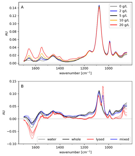 (A) Off-line spectra of varying concentrations of BSA in phosphate buffer (130 mM). (B) Off-line spectra of suspensions of whole cells, lysed cells, or a 1:1 mix of whole and lysed cells. Water was subtracted as background.