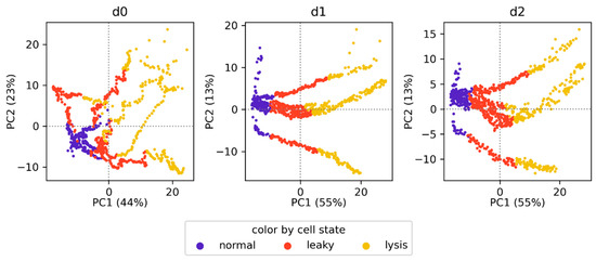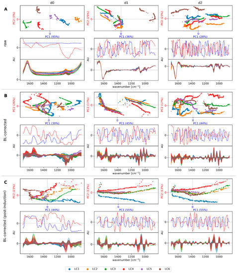 Baseline-corrected post-induction spectra color-coded by cell state. Parentheses show the percentage of variance explained by the respective principal component. The columns show zero-order (d0), first-order (d1), and second-order (d2) derivatives.