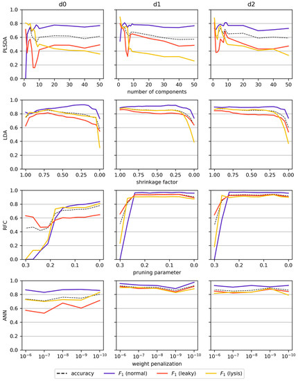 The issue of data scarcity was not given for the classification tasks since all spectra could be assigned to classes depending on whether thresholds in the reference data were exceeded. PLSDA, LDA, RFC, and ANN models were built for the supervised classification of normal, leaky, and lysing cells. Due to the high variance introduced by the spectral shift at the start of induction, only the baseline-corrected, post-induction spectra were used to train the models. The results for the initial grid-search assessing a wider set of parameters for the ANN model (hidden layer structure, number of epochs, weight penalization parameter) are summarized in Figure S2. For further analysis, ANN models with two hidden layers and 10 nodes each were trained for 75 epochs on the d0 and d1 dataset, and ANNs with two hidden layers and 200 nodes each were trained for 400 epochs on the d2 dataset. Figure 6 shows the results of the screening for the optimal regularization parameters for all models and each derivative applied during preprocessing. Among the linear models PLSDA and LDA, the latter showed significantly better performance with accuracies and F1 scores for all classes above 0.8 when high shrinkage was applied. ANN models in combination with the first derivative performed slightly better than LDA, whereas the best overall scores were achieved with RFCs in combination with the first and second derivatives (d1, d2). They each achieved accuracies of above 0.93 and F1 scores above 0.90 over a wide range of applied regularization parameters (Figure 6, Figure S3). Interestingly, the least regularized RFC and ANN models did not result in drastic performance reduction from overfitting, which could be well observed in LDA models. Nonetheless, regularization was applied to RFCs trained on d1 or d2 data for further analysis by setting the pruning parameter to 0.06.