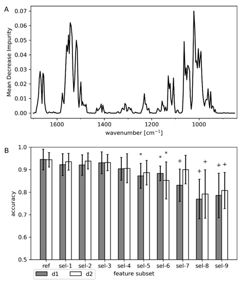 For RFC models, feature importance was assessed by the mean decrease (Gini-)impurity (MDI) after choosing the pruning parameter resulting in the highest classification performance. The MDI describes how much a variable contributes to a reduction in node impurity (in this case, the Gini impurity) in all trees of the random forest. For a detailed explanation of the MDI, the reader is referred to reference [39]. The MDI for all features (i.e., wavenumbers) was compared to known spectral features of pure components (e.g., amide bands, carbohydrate fingerprint), if available. To investigate the importance of certain spectral regions for model accuracy, subsets of features were then selected manually after preprocessing (Table 1). In general, features with the highest MDI and a putative link to known analytes (e.g., protein, lysed cells, carbohydrates) were removed, whereas others were retained. The spectral window was then narrowed down further in several steps to remove features that displayed smaller MDI values. After each feature selection step, LDA, RFC, and ANN models were trained and evaluated again.