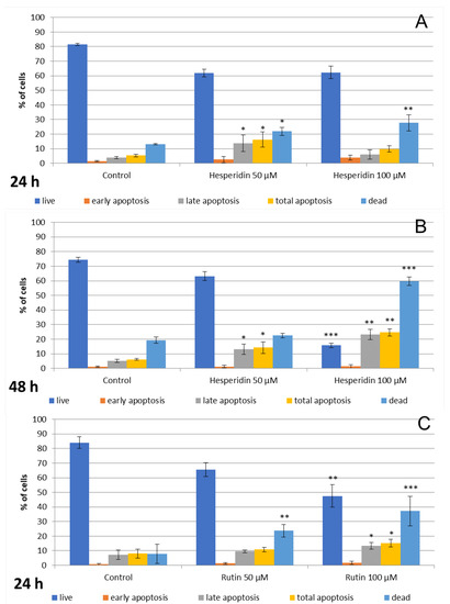Flow cytometric analysis results. A significant increase in the proportion of total dead Detroit 562 cells following 48 h (B,D,F) vs. 24 h (A,C,E) of exposure to Hes, Rut, Que of 50 and 100 µM concentration, compared to the control (* p < 0.05, ** p < 0.01 and *** p < 0.001). Vertical bars represent the standard deviations of the means (SD, n = 3 experiments).