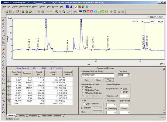 Here, oil samples were prepared and placed in special glass containers (vials) by a sampling device and then placed into an autosampler unit, which started analyzing the samples one by one after inserting them into the oven at a temperature of 80 °C. The dissolved gases were extracted from the oil sample inside the vials by increasing the temperature with continuous movement of the sample, which was left in the oven for 30 min. Then, the extracted gases were injected into the chromatography device (GC), where they were analyzed before the curves for each sample were drawn separately [23]. Figure 1 depicts the results analysis of the GC, including the chart that illustrates the time required to extract each gas and its concentration in ppm. Each of the dissolved gases appears at the peaks of the curves within a minute. The table in the screenshot also illustrates the percent of each gas as a percentage of the concentration of the total gases.