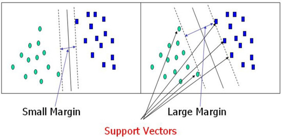An SVM is a type of machine learning that is used to separate two classes of data points by a hyperplane, which satisfies the maximum distance between the points of each class. Therefore, new observations can be accurately classified. The points outside the hyperplane margin belong to different classes. The number of input features identifies the dimensions of the hyperplane. A hyperplane is both a line that can separate two input features and a plane that can be used to separate among three features; when the input features increase to more than three features, the separation process becomes difficult. Support vectors refer to the points close to the hyperplane and have a great effect on the position and orientation of the hyperplane; they can be used to maximize the margin of a classifier. Support vectors are the main points that are needed to set up an SVM model. Figure 4 depicts the margin condition that can be built by support vectors, where the large margin indicates the ability of the SVM model to provide good classification accuracy with new observations [29,30].