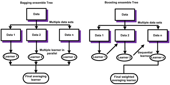 Ensemble methods are used to take advantage of decision trees and to reduce overfit, although they may sometimes become very complex. Decision trees are used in classification and regression operations, but their most common use is for classification operations. They are non-parameterized, do not include any assumptions about how the input data are distributed, and depend only on the input data for the input and response. They are suitable when there are a lot of data but there is not a lot of information surrounding that data. The results of a decision tree can be interpreted and thus used in constructing models to make inferences about data—not just to make predictions. Ensemble methods are quick due to their simplicity and are useful for initial understanding data. With decision trees, data processing is easy because there is no need to scale the data since the splits that occur at each node are only associated with one feature at a time and there is no need to perform coding operations for the splits, features, and categorizations. The two most common ensemble techniques are bagging and boosting ensemble trees. Boosting models are better than bagging models if the hyperparameters are precisely adjusted, but they consume more time in the classification process. Bagging models prevent overfitting even though they may not give better bias. Additionally, the boosting models generate models with few errors but are prone to overfitting because a single model that modifies itself is created, and the bagging models create multiple models that are parallel to each other [31,32,33]. Figure 5 illustrates the difference between bagging and boosting, where the bagging generates a parallel model for the classification process to prevent overfitting and the boosting generates only one model that is improved every time to reduce classification errors.