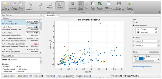 The used classification was supervised machine learning, where a constructed classification model learns to classify new observations based on the training process of trained samples. Several classification algorithms can be used in classification learner applications in MATLAB software. The classification process depends on the feature data and their corresponding responses. The different classifiers in classification learner application in MATLAB are decision trees (DTs), discriminant analysis (DA), support vector machine (SVM), logistic regression (LR), nearest neighbors (KNNs), naïve Bayes (NB), and ensemble classification (ENC). A constructed model can be exported to a workspace to test new observations and compute model accuracy based on testing samples.