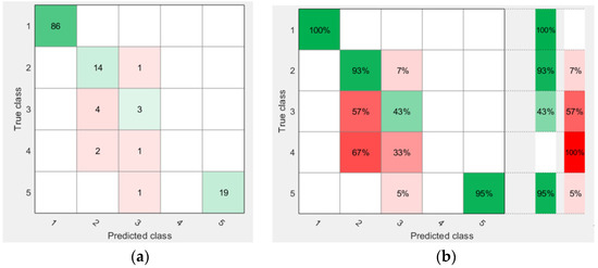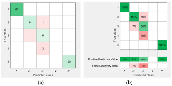 Figure 9 illustrates the confusion matrix of the ensemble bagged tree classifier, where the predictive accuracy of the classes was 93.1%, thus making this the best second classifier in the study. Figure 9a depicts the number of correct classification samples for each class, e.g., the number of correctly predicted samples for class 3 was 3/7 samples with a 43% classification accuracy (Figure 9b) and the number of wrongly predicted samples for class 3 was 4/7 with a 57% diagnostic accuracy (Figure 9b).