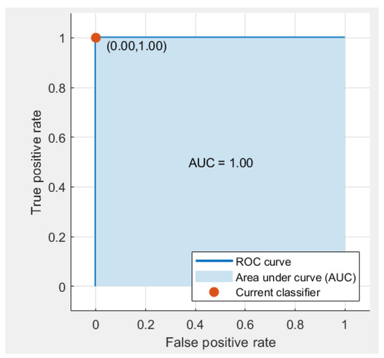 Figure 7 illustrates the confusion matrix of the classification accuracy of the decision tree classifier, which provided the best classification accuracy among all trained classifiers in the classification learner tool. Figure 7a shows the correct number of classifications in each classified class; for class 1, a total number of 86/86 samples were correctly classified, and for class 3, a total number of 6/7 samples were correctly classified. Figure 7b illustrates the classification accuracy of each class, where it can be seen that the predicted classification accuracy of class 1 was 100% (86/86 corrected samples), the predicted correct number of classified samples was 14/15 with a 93% classification accuracy for class 2; the false predicted classification accuracy of this class was 1/15 with a 7% classification accuracy. For class 3, the positive predictive accuracy was 60% (6 correct from a total number of 10 samples that were predicted for class 3) and the false predictive accuracy was 40% (4 wrong samples of the total number of 10 samples that were predicted for class 3). Figure 8 shows the receiver operating characteristic (ROC) curve of the positive class 1 that shows the performance of the classifier at the threshold of classification. The area under the curve (AUC) refers to the performance across all possible classification thresholds. The AUC indicates the 100% correct predictive classification of class 1, so the AUC was 1.