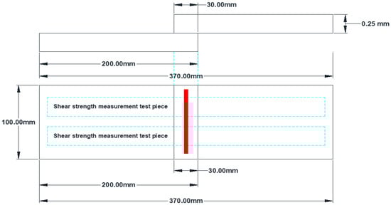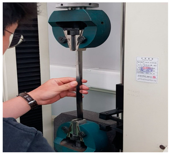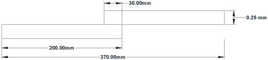 A shear tensile strength test was performed to analyze the fracture shape of a welding part and measure its strength. The tensile strength was measured using the Hounsfield H10KS universal testing machine (UTM), as shown in Figure 6. To measure the shear strength, a test piece with a size of 370 mm × 20 mm × 0.25 mm was made, as shown in Figure 7. The tensile speed was fixed at 5 mm/min.