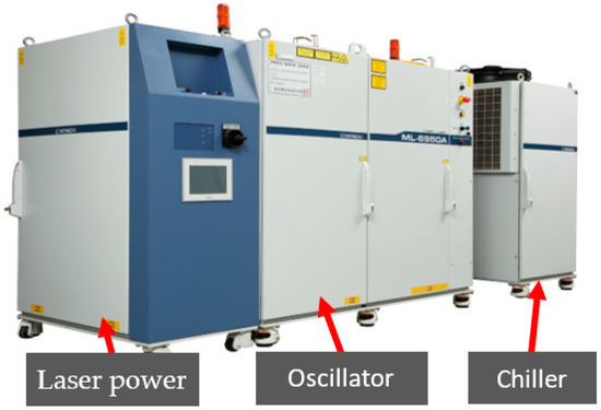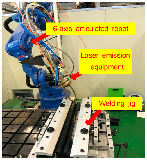 For laser welding, Miyachi 5 kW fiber laser welding equipment was used. The equipment consists of a laser welding oscillator, an optical system, a controller, and a chiller, as shown in Figure 4. The optical system used in this study has a spot diameter of 400 μm, a focal length of 148.8 mm, and a focal depth of 6 mm. The 6-axis automatic robot was from Yaskawa.