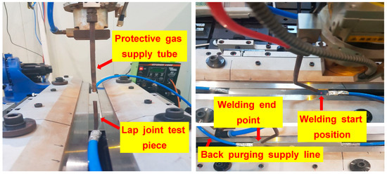 In this study, all surfaces except 20 mm around the welding line were tightly fixed in order to control the welding deformation as much as possible and to minimize the gap between the specimens for the lap joint welding. Two specimens were inserted and fixed in the middle of the jig as shown in Figure 3.