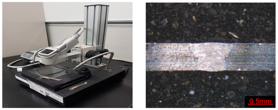 A macro test was performed to analyze weld zone, width, and penetration. The test was performed based on ASTM E340 and the environmental conditions were a temperature of 23 °C and a humidity of 43% RH, and 3% Nital was used as etching solution. The etched cross-section was observed using equipment made by Olympus and is shown in Figure 5.