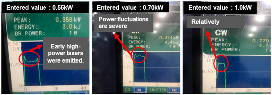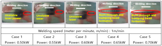In Cases 1 and 2, there was no penetration due to welding failure. Case 3 showed partial welding and Cases 4 and 5 made a back bead through sufficient penetration, but there was also a humping bead. In addition, through laser power monitoring, it was confirmed that the high-power laser oscillated in the initial stage compared to the input power during low power welding, and it was further confirmed that its output was stable at 1 kW or more. The results are shown in Figure 9.