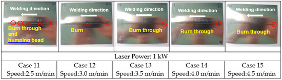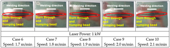 It is necessary to increase the laser output power to avoid the welding defects seen in Cases 1 to 5, and the second preliminary experiment for the five cases was performed using the welding speed as a variable after fixing the output value to 1 kW where stable laser power is generated. Each experimental condition is shown in Table 4.