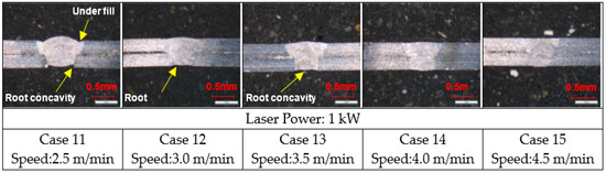 As Table 6 shows, Cases 11, 12, and 13 showed a negative value for the back bead height. If the back bead height value is negative, it is considered that root concavity has occurred. In other words, Cases 11, 12, and 13 showed welding defects due to the occurrence of root concavity. Cases 14 and 15 have positive values for the back bead height, meaning back beads were successfully created. Next, the values measured from cross-sectional observation were compared and analyzed for each laser speed. The trends of top bead width, top bead height, weld zone width, back bead width, back bead height, and penetration depending on laser speed increase are as shown in Figure 14 below.