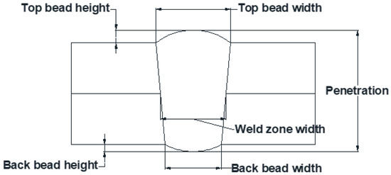 Through a visual observation, no internal crack was found in the welding part in Cases 11 to 15, but there were under fill and root concavity in Case 11 and root concavity in Cases 12 and 13. In Cases 14 and 15, there were complete penetration and back bead without any visible cracks or porosity. Next, the top bead width, top bead height, weld zone width, back bead width, back bead height, and penetration of Cases 11 to 15 were measured as shown in Figure 13. Table 6 shows the cross-sectional observation results and the measured values for each welding condition.