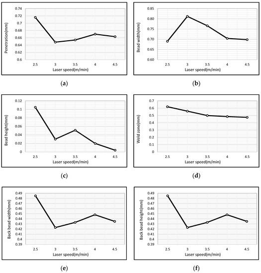 In Figure 14, it is not easy to see the tendency related to laser speed at 2.5 m/min, 3.0 m/min, and 3.5 m/min conditions in (a) Penetration, (e) Back bead width, and (f) Back bead height. This is because the value has been affected by the occurrence of root concavity. As the laser speed increased, the (b) Bead width, (c) Bead height, and (d) Weld zone values tended to decrease. It was confirmed that the back bead was created under the conditions of laser speed 4.0 m/min and 4.5 m/min in the (f) Back bead height graph.