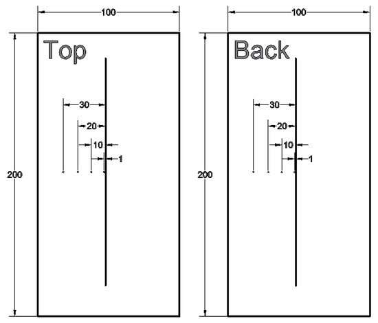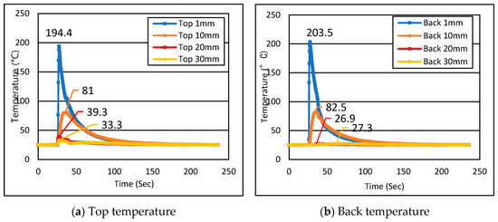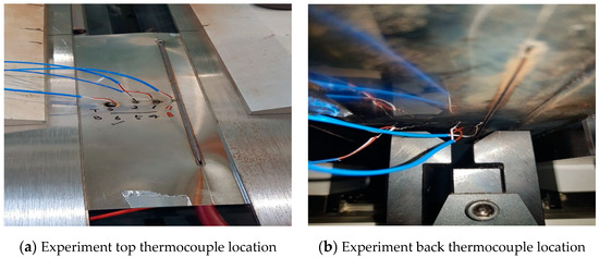 The temperature in the vicinity of the welding part was measured in order to check the heat-affected zone of the fiber laser of 0.25 mm thick ASTM F1684. A reproduction experiment was performed by applying the welding conditions of Case 14, which did not show welding defects in the cross-sectional analysis, as shown in Section 3.1. To measure the temperature, one thermocouple was attached to each of the top and back surfaces. The temperature was measured at four locations, i.e., 1 mm, 10 mm, 20 mm, and 30 mm, as shown in Figure 18 to check the temperature at a location as close to the welding line as possible, and the actual attachment is shown in Figure 19.