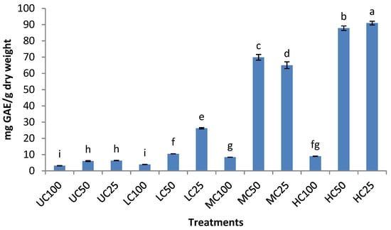 Total polyphenol content of air-fried eggplant. The treatment codes consisting of different letters and digits represent the uncooked (UC), high-cooked (HC), medium-cooked (MC), and low-cooked (LC) eggplant samples extracted with absolute ethanol (100), 50% ethanol (50), and 25% ethanol (25). The bars containing different letters are significantly different from each other (p < 0.05). GAE: gallic acid equivalent.