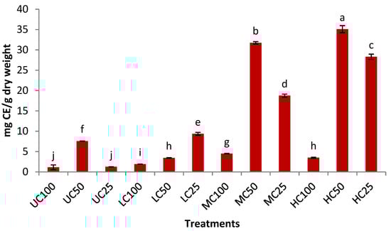 Total flavonoid content of air-fried eggplant. The treatment codes consisting of different letters and digits represent the uncooked (UC), high-cooked (HC), medium-cooked (MC), and low-cooked (LC) eggplant samples extracted with absolute ethanol (100), 50% ethanol (50), and 25% ethanol (25). The bars containing different letters are significantly different from each other (p < 0.05). CE: catechin equivalent.
