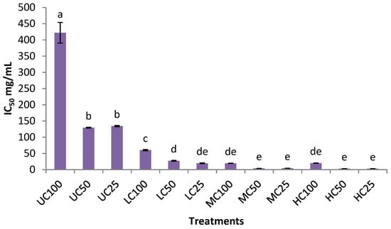 DPPH scavenging of air-fried eggplant. The treatment codes consisting of different letters and digits represent the uncooked (UC), high-cooked (HC), medium-cooked (MC), and low-cooked (LC) eggplant samples extracted with absolute ethanol (100), 50% ethanol (50), and 25% ethanol (25). The bars containing different letters are significantly different from each other (p < 0.05).