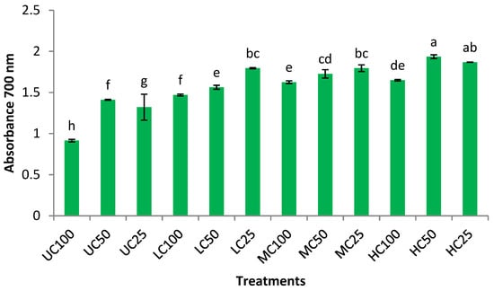 Reducing power of air-fried eggplant. The treatment codes consisting of different letters and digits represent the uncooked (UC), high-cooked (HC), medium-cooked (MC), and low-cooked (LC) eggplant samples extracted with absolute ethanol (100), 50% ethanol (50), and 25% ethanol (25). The bars containing different letters are significantly different from each other (p < 0.05).