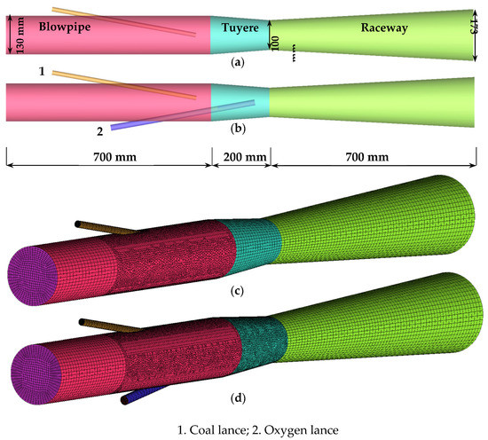 The study was based on a blast furnace of 120 m3 because a test oxygen blast furnace of 120 m3 will be designed and built based on it. The raceway depth of the blast furnace was about 700 mm. Previous studies showed most pulverized coal particles in the raceway region flow around the tuyere centerline due to having a fast blast speed, and the burnout at the end of the raceway represents that of the overall raceway [19]. Therefore, the raceway was simply designed as a gradually expanding tube following others [10]. The geometric details of the models are shown in Figure 1a,b. Furthermore, the diameters of coal and oxygen lances were 15 mm and 20 mm, respectively. The model geometries simulated include the lances, blowpipe, tuyere, and raceway of a blast furnace. For the base case, the coal lance tip was located on the tuyere centerline, as shown in Figure 1a. For the targeted oxygen-enrichment case, the oxygen lance tip was located on the tuyere centerline and the coal lance tip was above the tuyere centerline, as shown in Figure 1b. In this model, the hybrid mesh was used, as shown in Figure 1c,d.