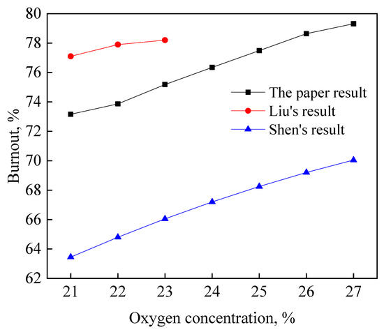 Furthermore, the effect of oxygen concentration on coal burnout under simulated blast furnace conditions was investigated by CFD model, as shown in Figure 5. When the oxygen concentration had a 1% increase, the coal burnout had about a 1% increase. The values show a reasonable agreement with that of Shen and Liu [10,11]. The comparisons indicate that the simulated model is reliable.