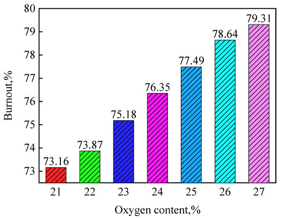 Figure 8a shows the effect of oxygen content on final coal burnout under targeted oxygen-enrichment. When oxygen content was 22%, the coal burnout was 83.75%, an increase of 10.59%, which was close to the theoretical increase of 11.39%. However, the coal burnout slowly changed as more oxygen was added. The coal burnout was 86.29% at 24% O2 content, an increase of 13.13%, which was the maximum. Then the coal burnout slowly decreased as more oxygen was added.