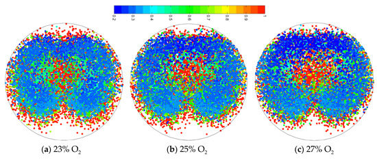 However, the new lower-burnout area occurred under targeted oxygen-enrichment. Figure 10 showed the coal particles that burnout was less than 0.5, which was described as targeted particles. For the base case, the targeted particles were mainly concentrated in the center region of the coal plume. However, the targeted particles were more dispersed under targeted oxygen enrichment, which was distributed around the coal plume. This was mainly because the oxygen stream flowed into the center of the coal plume, where the coal particles rapidly burnt and dispersed toward the around region. The coal burnout of targeted oxygen-enrichment was higher than that of the base case, but decreased with an increase in oxygen concentration. The oxygen has exceeded that the coal combustion needed, and the room-temperature oxygen had some adverse effect on coal combustion. The benefits outweighed the injuries with an increase in oxygen content. Furthermore, it was more difficult for oxygen to approach the newly targeted area. This further explained the results shown in Figure 8.